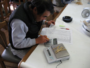 それから、枝梗(しこう・穂の先のもみを付けた細い枝)の数、もみの全数、その内の実になっていない数をそれぞれ数えます。もみの全数を調べるのは手間がかかりますが、カウンターを使い一粒、一粒ていねいに数えます。