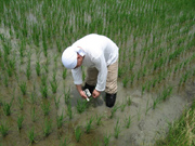 昼食時には磐田地区の会員、JA関係者、そして、花の舞の土田杜氏も合流して人数が増えました。午後の部最初の巡回は研究会相談役の乗松精二さんの圃場。一行が到着しても乗松さんの姿はなく、どうしたのかと心配していると、砂煙をあげながらトラックでかけつけました。聞けば、昼まで田植えをしていたとのこと。ちょうどこの日ですべての田植えが終了したそうで、顔はすっかり日焼けしていました。乗松相談役と顔を合わせるのは3月に行われた研究会の総会以来という会員も多く、しばし、なごやかに歓談しました。この後一行は、磐田、森町、袋井地区を夕方まで精力的に巡回しました。鈴木会長は「分けつの状況をよく見て、中干しに入ってほしい。今のところ生育は順調です」と総括しました。