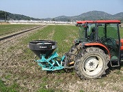 静岡山田錦研究会の鈴木会長は4月2日山田錦の圃場(田んぼ)に土壌改良剤を入れました。これは毎年この時期に行っているもので、土壌改良剤を入れた容器をトラクターの後ろにセットし、圃場の外側からゆっくり進みながらまんべんなくまいて、だんだん内側に向かっていきます。広い圃場ですがトラクターを使えば5分ほどで作業は終了します。この後は土壌改良剤が流れないよう土の中に入れるために、もう一度圃場を軽く打ち(起こす)ます。