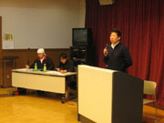 勉強会は事務局の斎藤主任の司会進行で始まり、鈴木良紀会長の挨拶の後、花の舞酒造の土田杜氏が登壇し、花の舞が現在取り組んでいることや研究会との関係について考えを述べました。土田杜氏は営業で東京地区のお客さんと話をした際のエピソードも披露、「研究会の山田錦のデータをお客さんに見せると説得力が増します。花の舞の酒づくりに関し、米からそのプロセスを説明できるのはうちだけ。自慢です」と語りました。そして、「今年も良質な山田錦をつくってください」と激励しました。