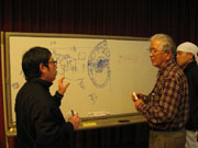 この後は、地区ごとに分かれ、副会長がリーダーとなってグループ別勉強会を行いました。この間、花の舞の青木副杜氏と斎藤主任が米に関する質問を乗松相談役にしてレクチャーを受けており、勉強はあちこちで行われていました。