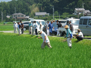 静岡山田錦研究会の定例活動である今年1回目の圃場巡回が7月10日に行われました。この圃場巡回は会員の圃場(田んぼ)を回り、稲の生育状態を視察するもので、会員の圃場が遠州地方(静岡県西部地区)に広く分布しているため、例年各地区の代表圃場を巡回しています。