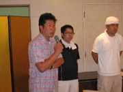 昼食会場には午後の巡回に参加する会員もやってきて人数がまた少し増えました。食事の前に、鈴木会長が午前中の巡回を総括して話しをしました。そして、花の舞酒造の土田杜氏も挨拶をし、「梅雨明けが早く、高温が続いていますが、みなさんはプロだから肥料や水管理などきちんと対応されると思います。秋には私たち、そして、みんなが喜ぶ米にしていただきたい」と会員のみなさんを激励しました。