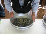また、今回は11月に行われた成分検査会でできなかった、米の大きさの測定も行われました。 刈り取り、乾燥・もみすりをして、大きさを分ける選別機にかける前の米を会員全員に提供してもらい行うものです。