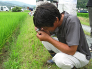夏2回目であるこの巡回で重要なのは幼穂(ようすい)のチェックです。幼穂とはその名の通り、やがてりっぱな穂になる若い穂のこと。今はまだ地面から10?15cmほどの茎の中にあり、外側からは見ることができません。そこで、茎を縦に裂いてその断面で幼穂の長さを計ります。「去年は田んぼによって大小バラつきがありましたが、今年は出方が揃っています。だから、みんな同じ頃に穂が出るかもしれません。今の大きさは1ミリから2ミリくらい。例年に比べ少し遅いです」。それでは穂が出るのはズバリいつ頃なのか聞くと、「9月上旬頃でしょう。例年より少し遅いかもしれません」と鈴木会長は予想しました。