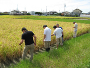 天気は晴れ。前日からかなり涼しく秋らしくなりましたが、この日は、やや暑さがぶり返し、車内ではエアコンが必要となりました。巡回に同行できない会員は自分の圃場で一行を待ち受けます。前回の圃場巡回は8月5日でしたから、久しぶりに顔を合わせ、つかの間の米づくり談義を楽しんでいる会員も見受けられました。圃場評価の巡回は精力的に昼過ぎまで行われました。