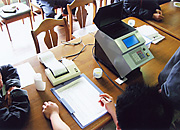 ![]() 係が成分分析機にかけてタンパク質含有量を記録する |